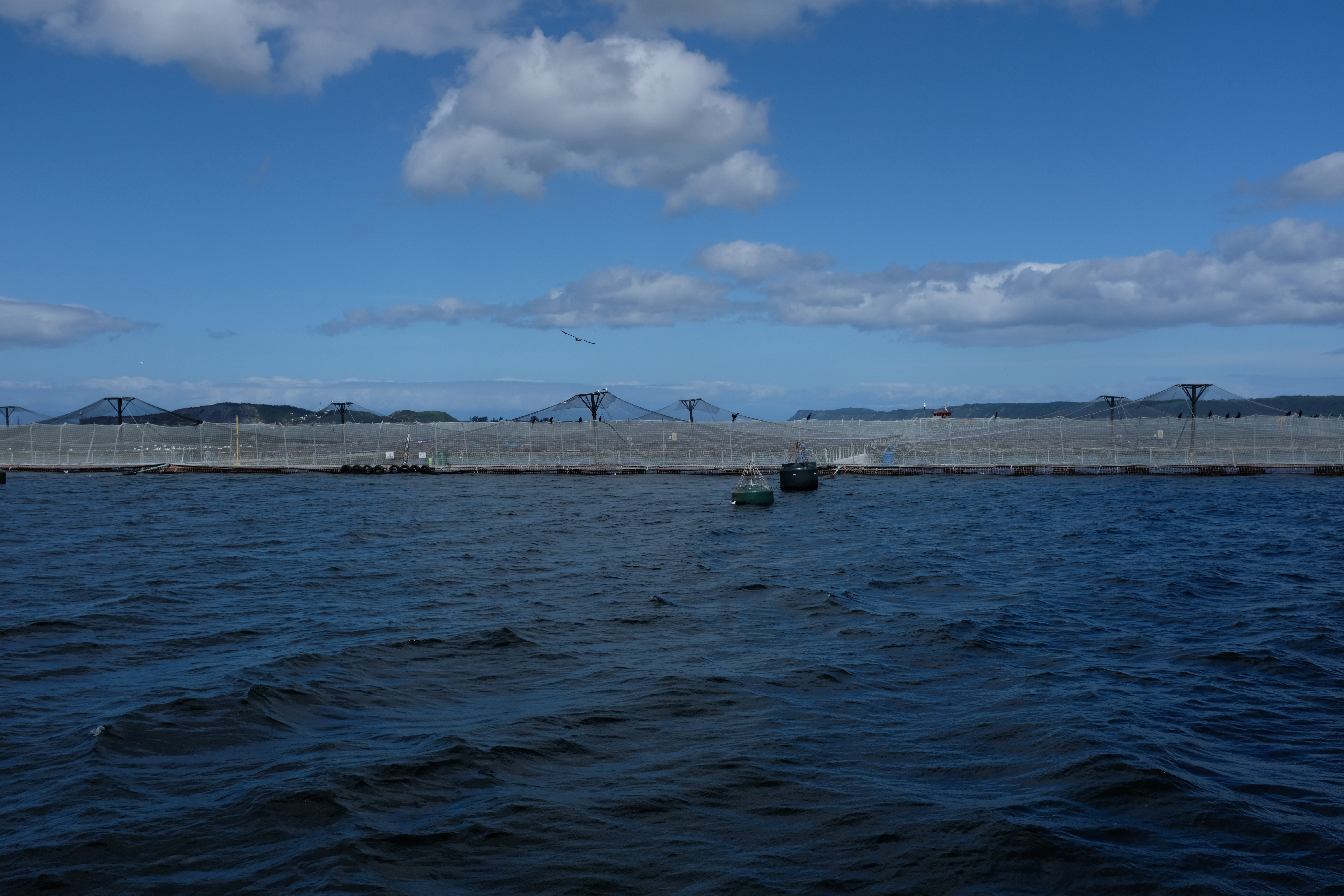 A salmon farm with the corner of the netting that keeps sea lions out pulling away from the corner.