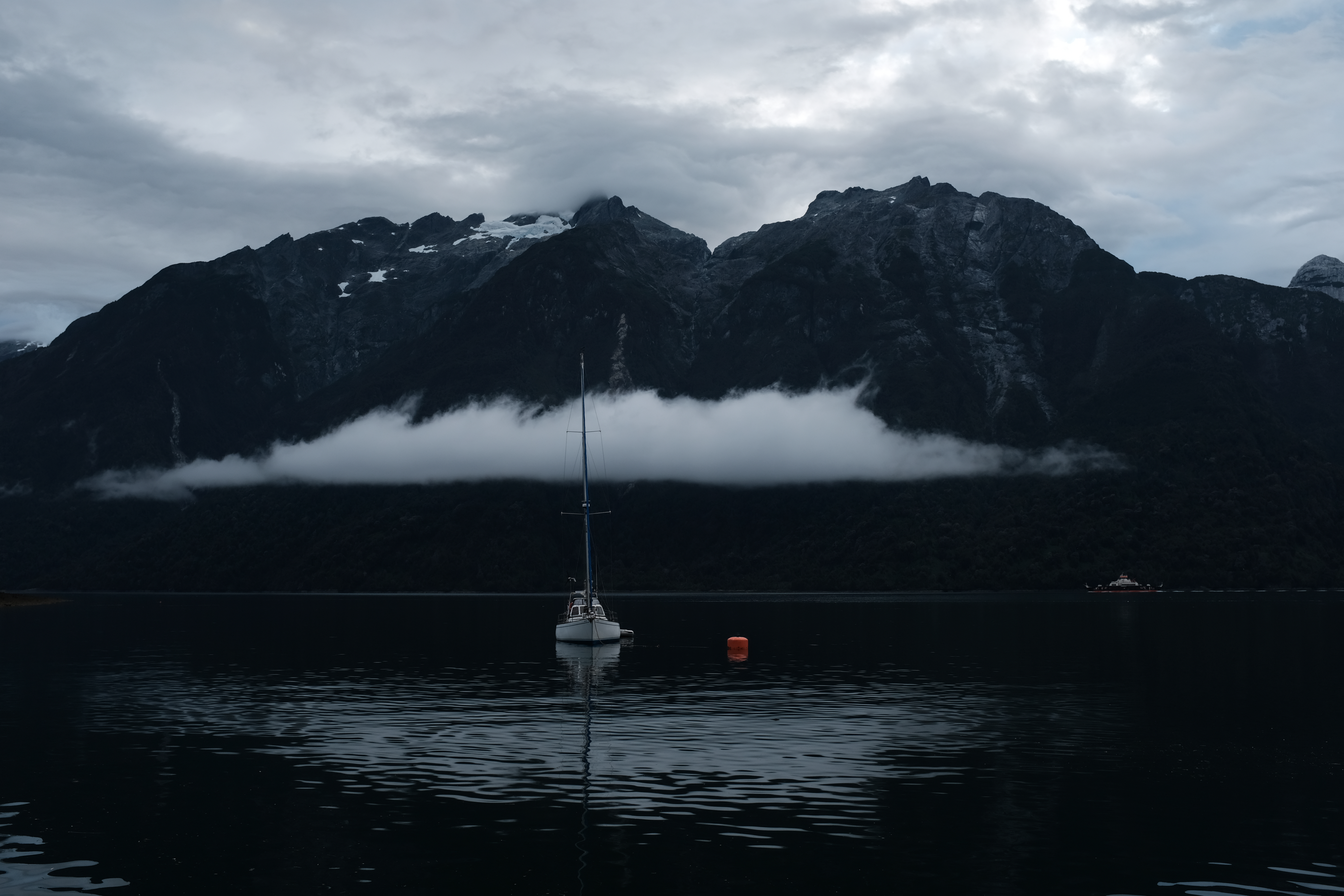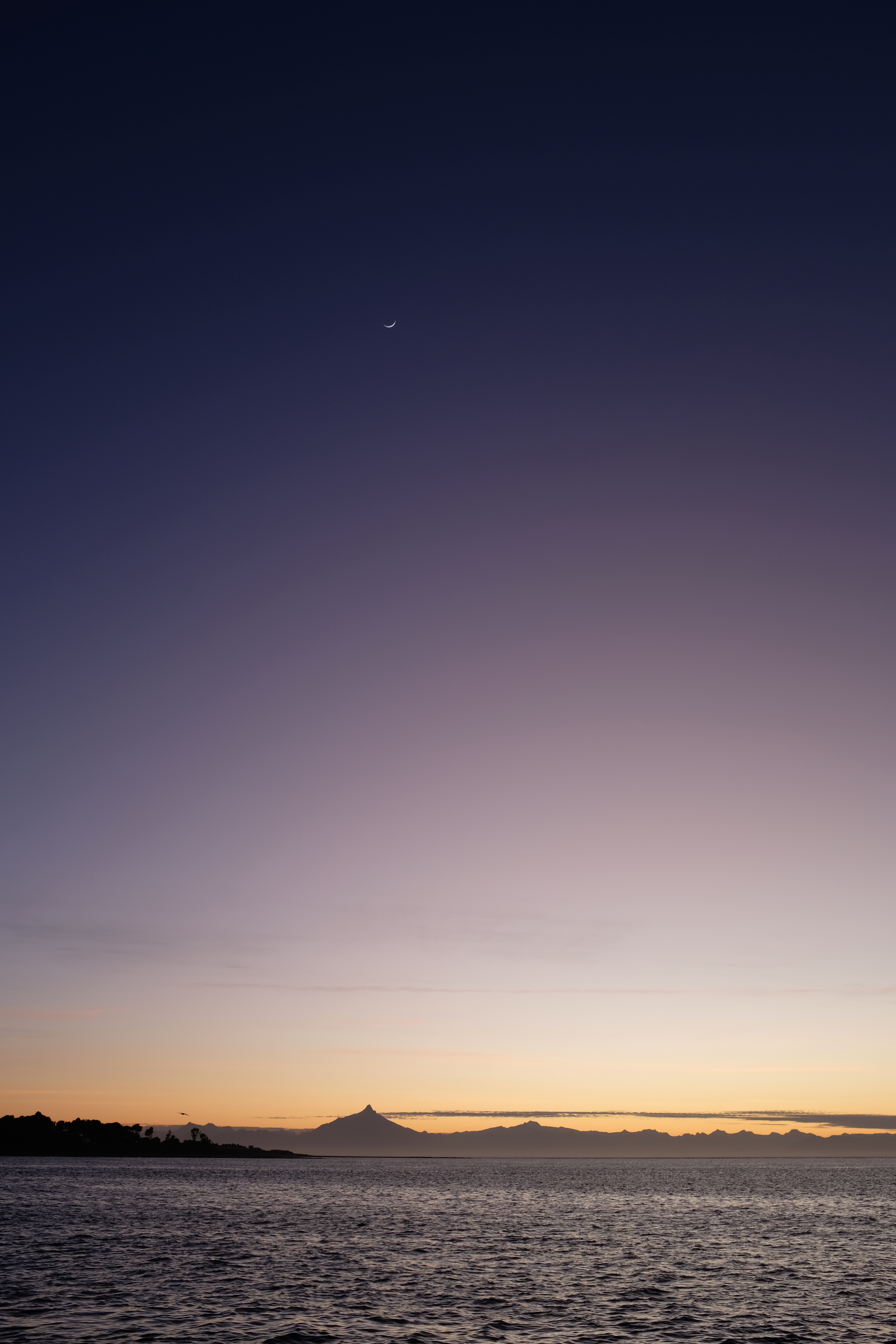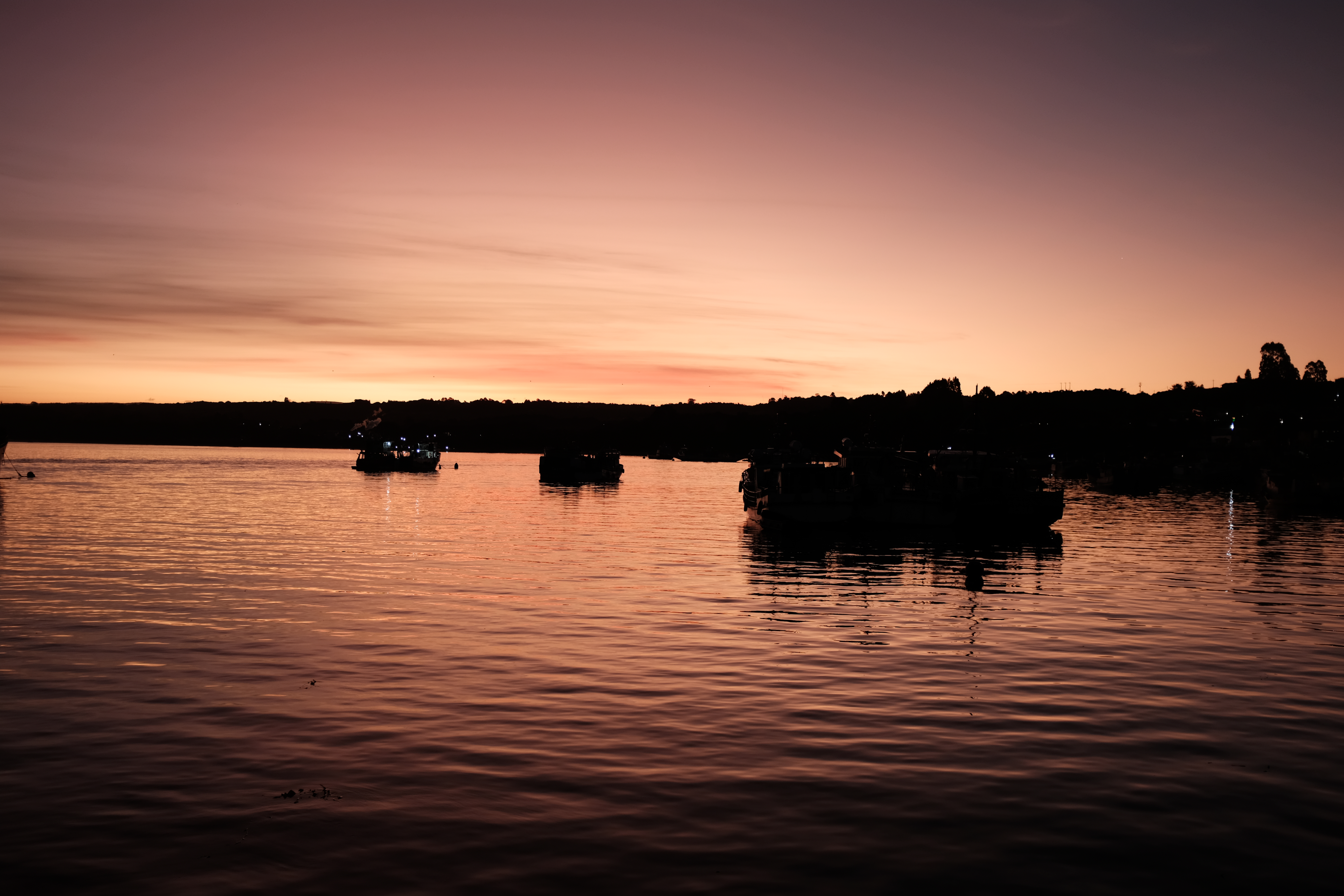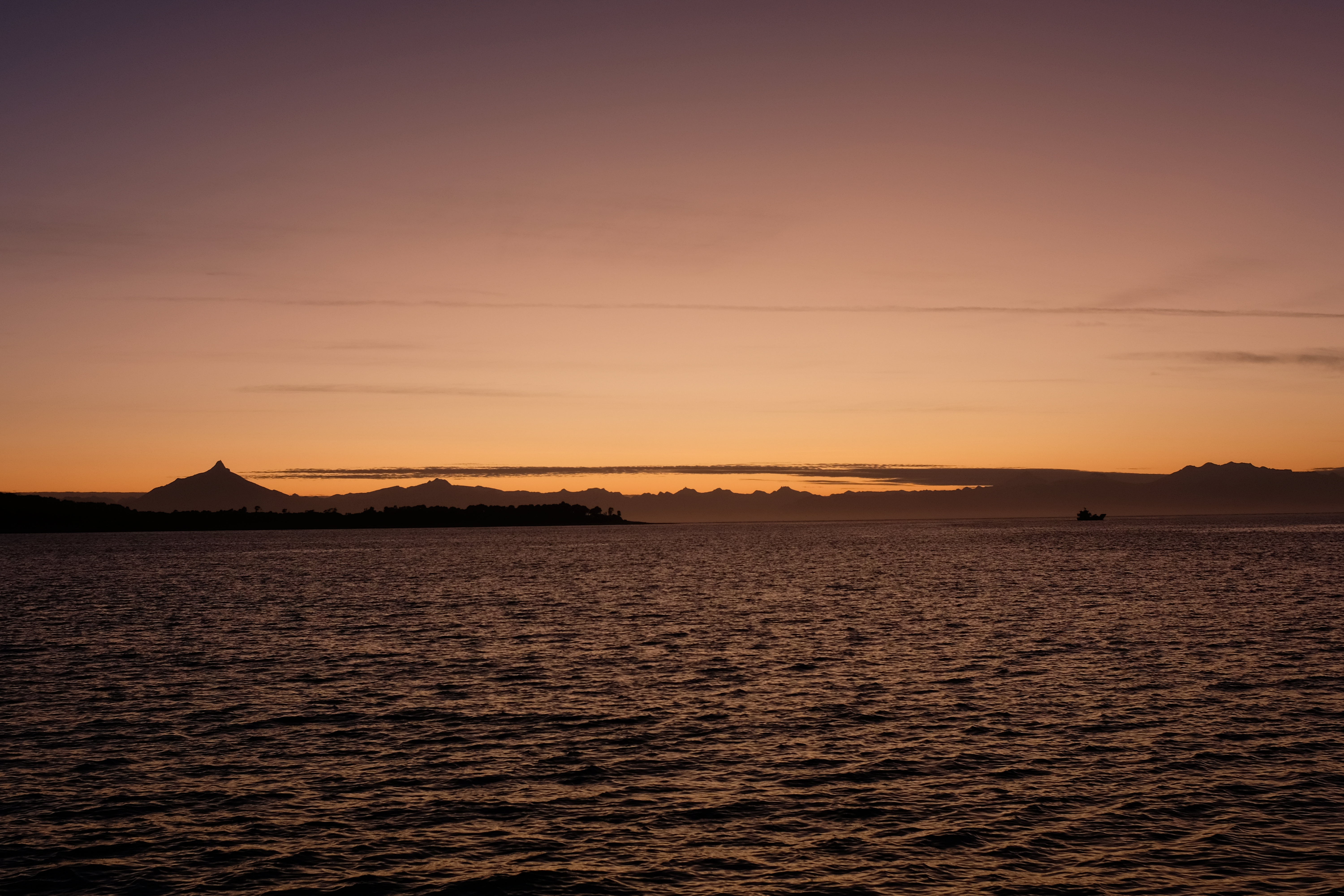 The silhouette of a fishing boat at sunset, with the Corcovado Volcano on the left.