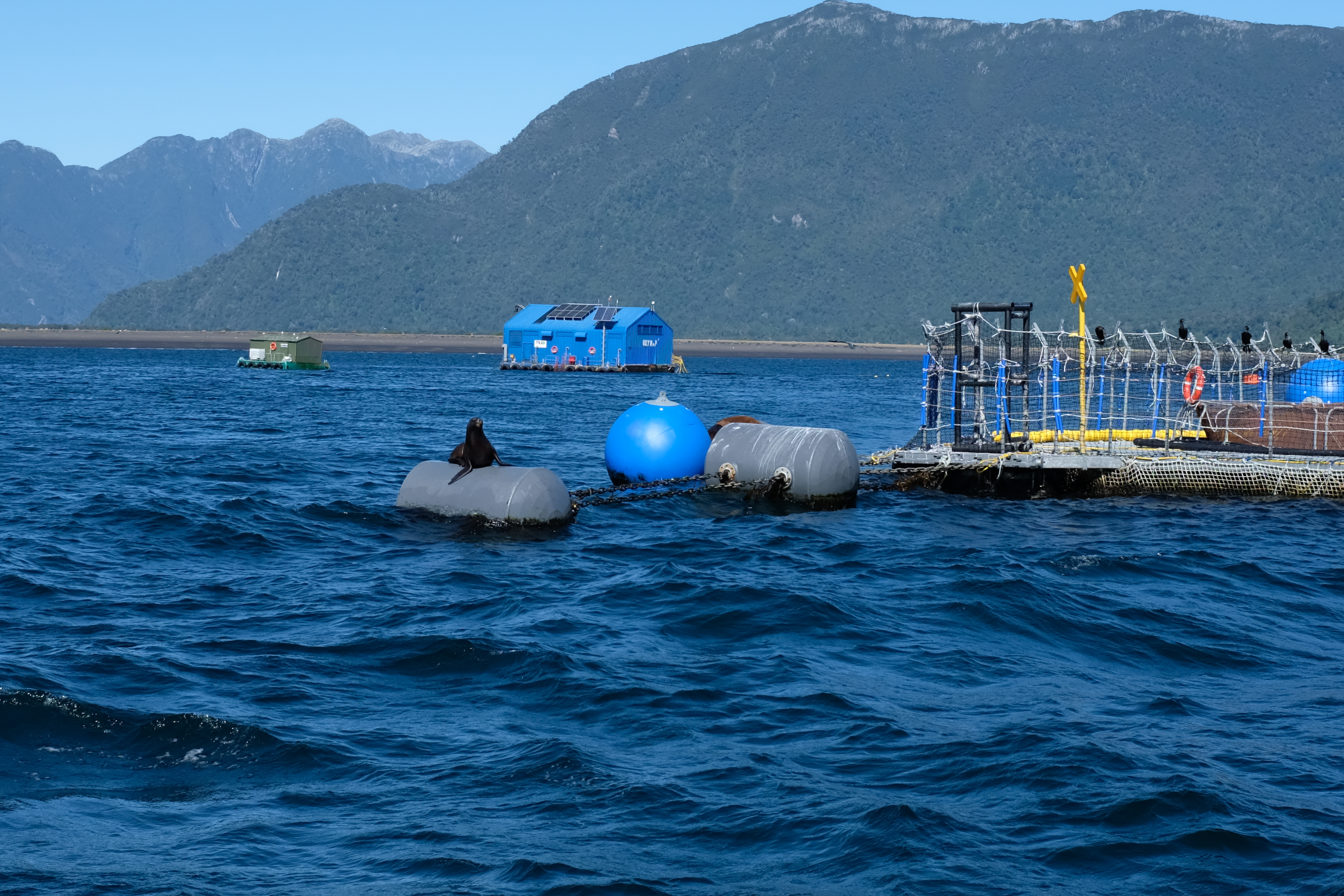 A sea lion hanging out near a salmon farm with the protective netting falling off.