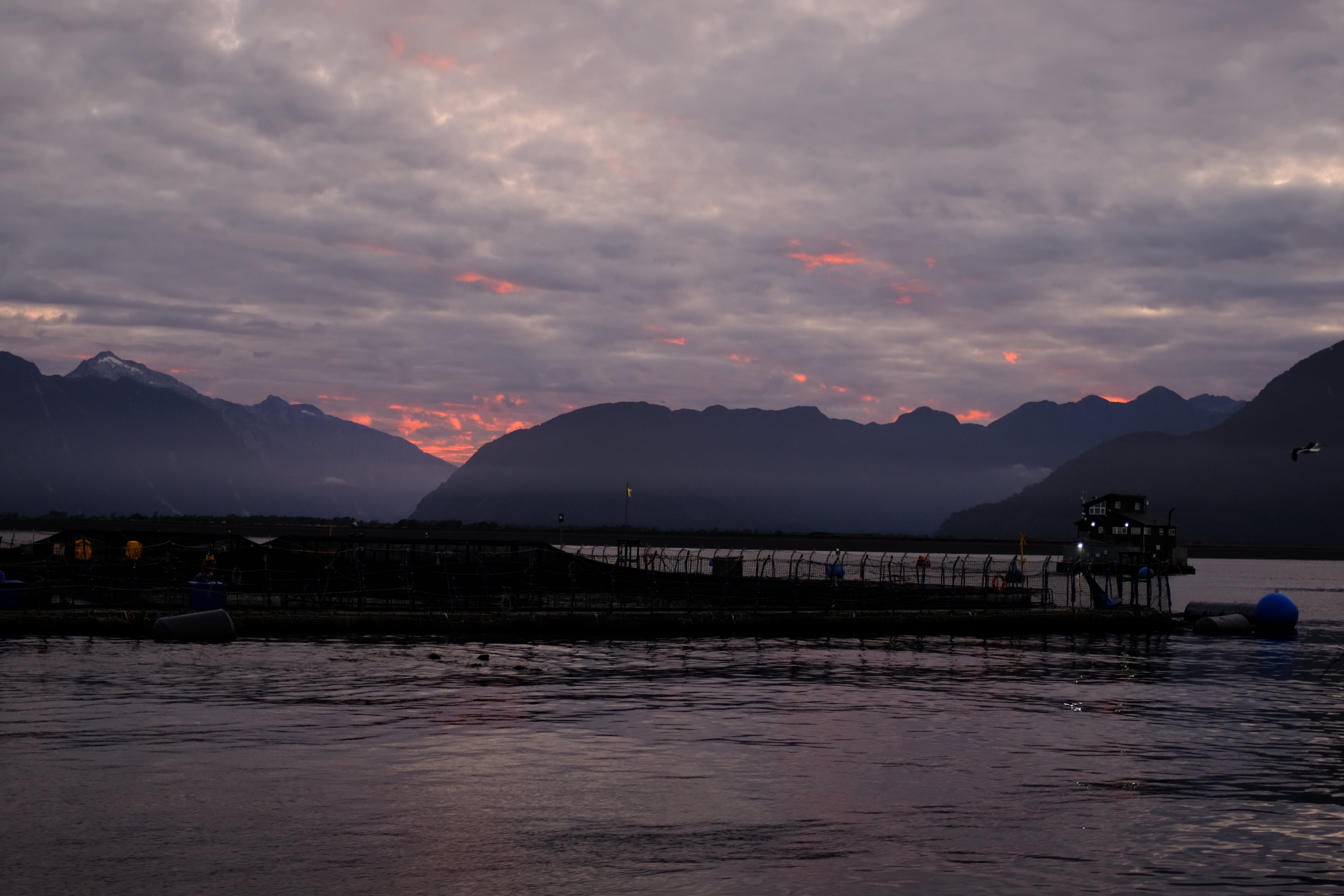 Night lights at an inactive salmon farm (foreground) and an active salmon farm (hazy light in background) in Comau Fjord.