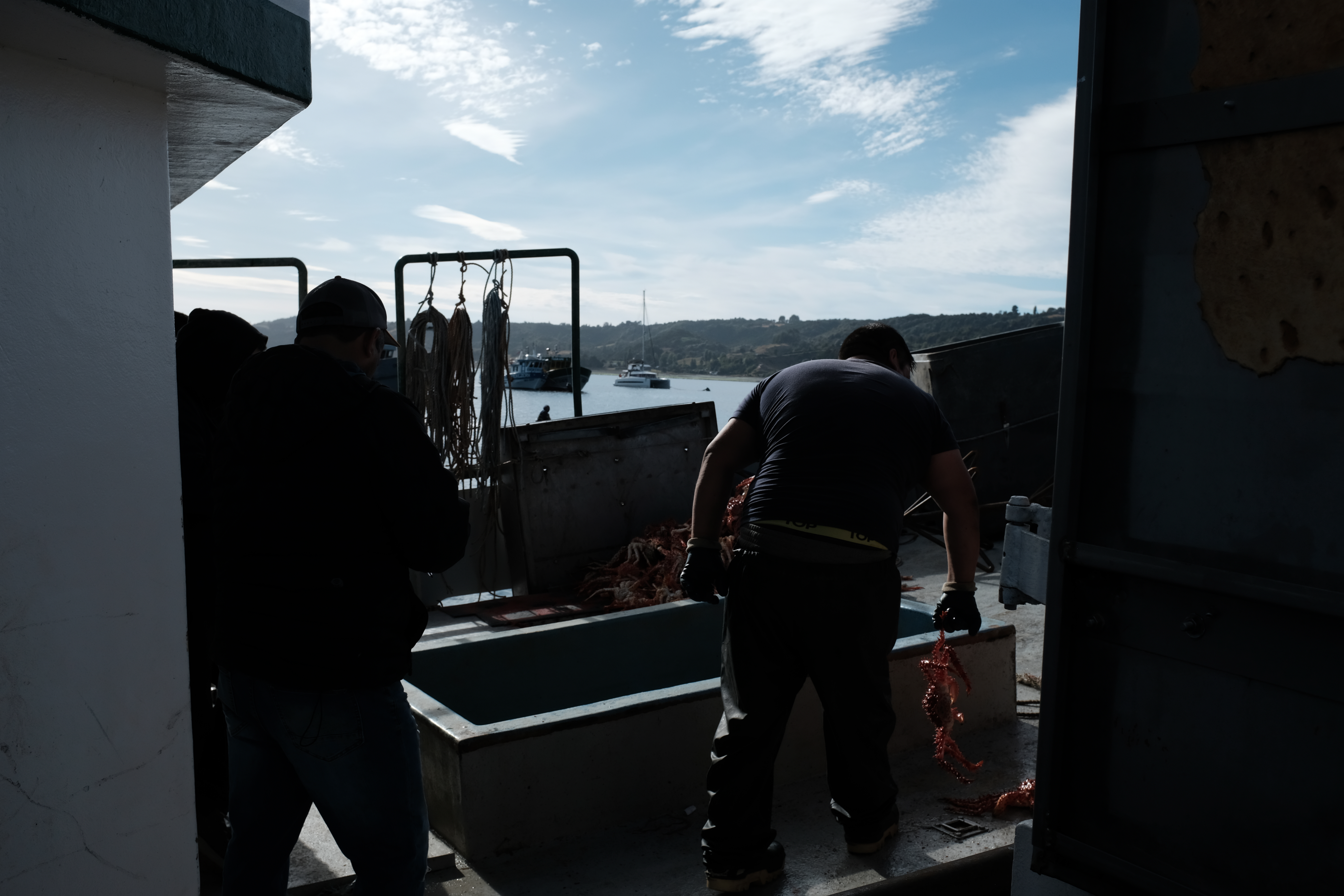 Government officials monitor local fishermen unloading shellfish in Dalcahue.
